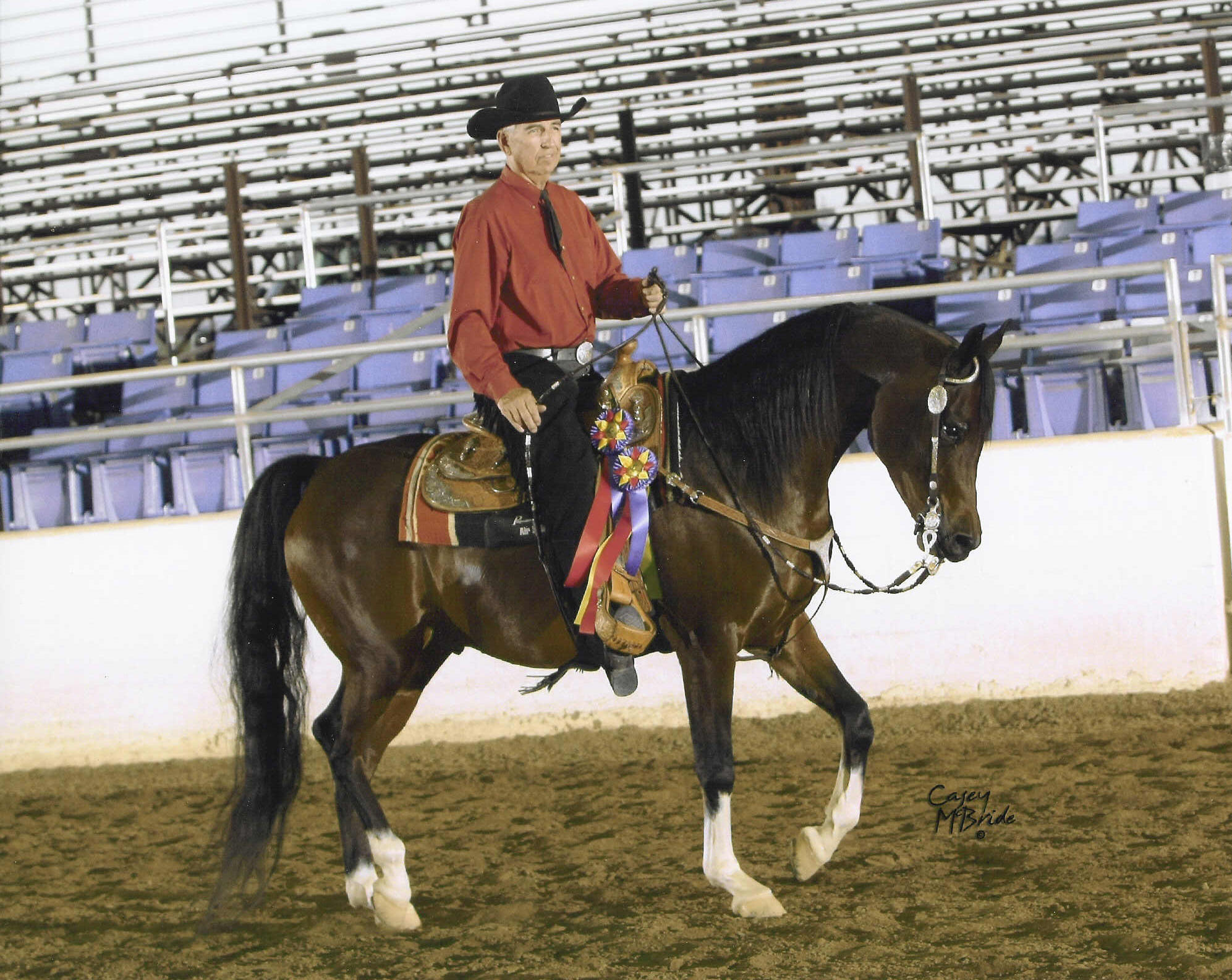 involved in raising and showing horses: For several years, I did breed, raise and train my own horses. It takes a lot of time and effort to breed and raise foals. From the start of breeding until 3 yrs old, an owner really has no idea what kind of horse it will turn out to be. Now, I look for certain pedigrees that I know are quick minded, gentle and take to training easily. It's still very much a guess but buying them at 2 or 3 yrs old saves 2- or 3 yrs of the process. And don't forget the gestation period of mares is 11 months and can range up to 12 months safely. So, once you decide to breed, it's 4yrs until you know what kind of riding horse you will have. Some start at younger ages but I start them at 3 yrs of age. That's when the knee growth plate is closed and they can take riding pressure. - Do you do the training and show preparation yourself? I've done it both ways. My normal method is is train myself and show myself. Since I no longer breed my own, I buy my prospects, break them to ride and then send them to a trainer for getting them in the correct body frame for their show gaits...the jogtrot, lope and walk. The exception to the training regimen for me is for the Arabian Nationals Competition which requires the help of a professional trainer. But that's another story. - What horses do you have now / what have you had? I've had a lot of horses over the years before I settled on Arabians. I've had Quarter horses, a Morgan, some grade horses, and a Palomino. I bought my first horse in 1960 at a horse auction in Neoga. She was a big strawberry roan mare with one blind eye. She was a nice looking horse and I paid $110 for her in 1960...which was quite a lot of money for me. Unknown to me, she had been sedated and was easy to handle ... until the next day. It took several days to get in the stall with her...she was a bit mean but I eventually worked it out of her. I sold her a few years later for $90. - Why did you choose Arabians as opposed to other breeds? I became impressed with the intelligence, beauty and friendliness of Arabians. Arabians come from the Arabian Peninsula in desert areas. For thousands of years, the Bedouins selectively bred for the best, smartest and most tractable horses. They were pets but earned their keep. They were always kept in close proximity to humans to the point that they were housed in the tents with the people at night....for protection. Naturally, they wanted people oriented horses. Those that were people oriented and were the prettiest of the breed were the ones that were the most sought after. So over the thousand of years of breeding for the best traits, we have the fruits of that selective breeding. One thing most people don't know is that purebred Arab horses only come in Bay, Chestnut, gray and black. There are few truly black horses because the Bedouins considered them the work of the devil and killed them. Similarly, they liked the gray (white) horses as a symbol of good. So the black Arabs of today are the product of recessive gene breeding to get the black coat. - How are Arabians named?