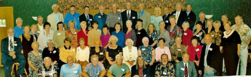 Second Row (seated) L-R: Sam Dempster (seated on stool), Janet Wicker Dobbertin, Linda Tate Nelson, Gloria Shields Bates, Betty Fuqua Harris, Sandi Rutherford Esworthy, Jean Willms Holderby, Alice Eversole, Marilyn Schmitt Harris, Nancy Taylor Wade, Marilyn Chaney, Sharon Essex Walters, and Phil Blankenburg (kneeling in dark jacket) Some scenes from the 50th Reunion - 2008 (click to expand the photo)